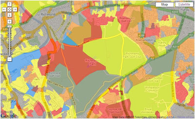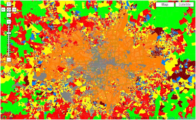 Using our labs Google Map Creator it is possible to view the Output Area classification of the UK. The Output Area classification (OAC) distills key results from the 2001 Census for the whole of the UK at a fine grain to indicate the character of local areas. It was created in a collaboration between the Office for National Statistics (ONS) and the University of Leeds using the same well established methods as the related classifications of local authorities and wards.