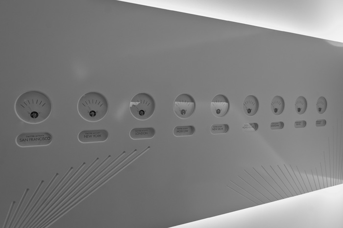 The analogue meters display the level of tweeting in 9 cities (San Francisco, New York, London, Moscow, Shanghai, Tokyo, Hong Kong, Sydney and New Delhi).
