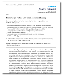 Future Internet has published – Schroth, O.; Pond, E.; Campbell, C.; Cizek, P.; Bohus, S.; Sheppard, S.R.J. Tool or Toy? Virtual Globes in Landscape PlanningFuture Internet 20113, 204-227.